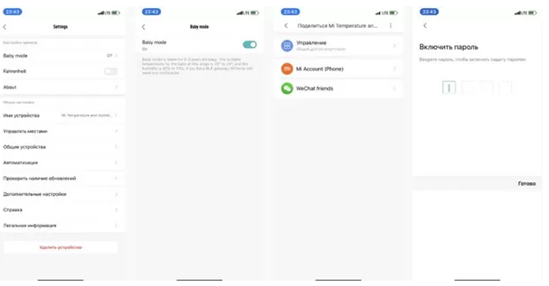 Интересным решением стал режим Baby mode. На экране телефона появляется сообщение о том, что показатели выше/ниже комфортных для ребенка (20-24°С и 45-70%) в детской комнате. Есть возможность добавления пароля на доступ.
