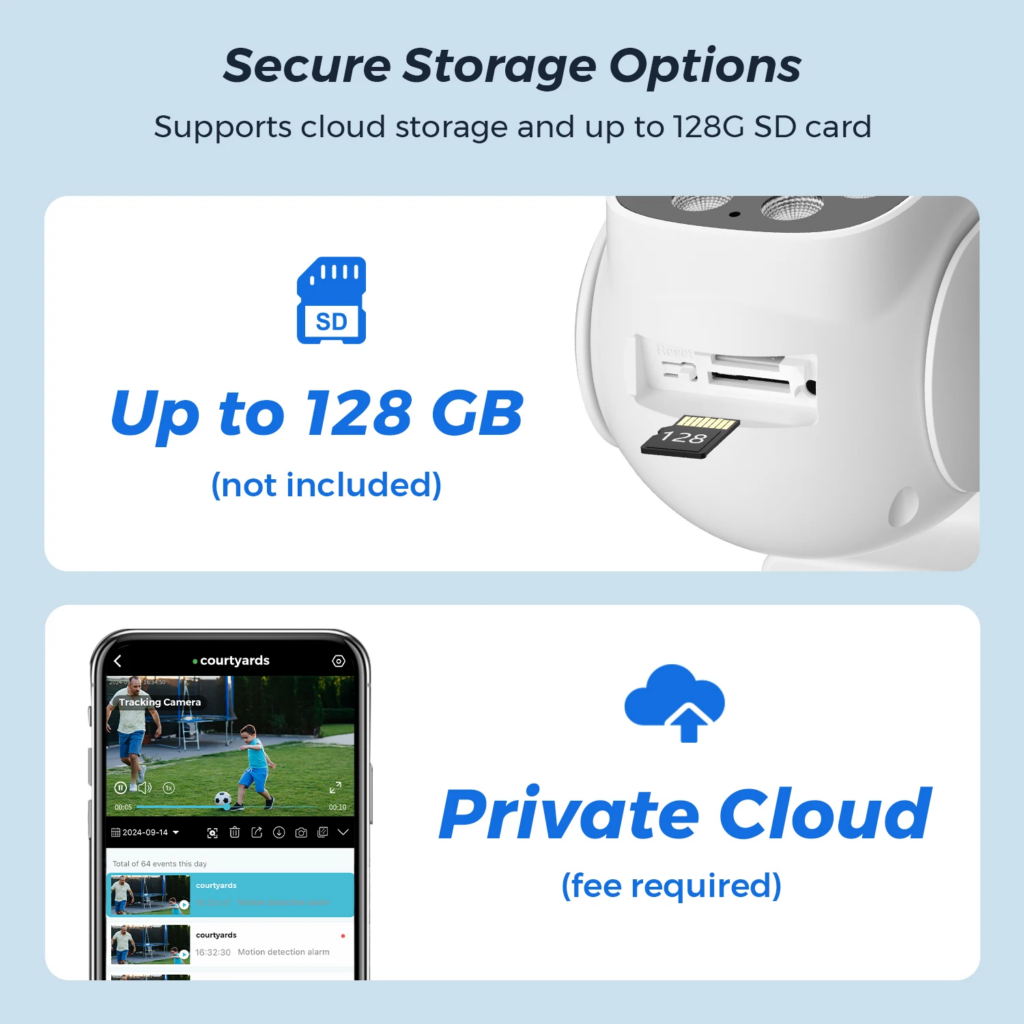 Підтримка хмарного сховища та SD-карти об’ємом до 128 ГБ.