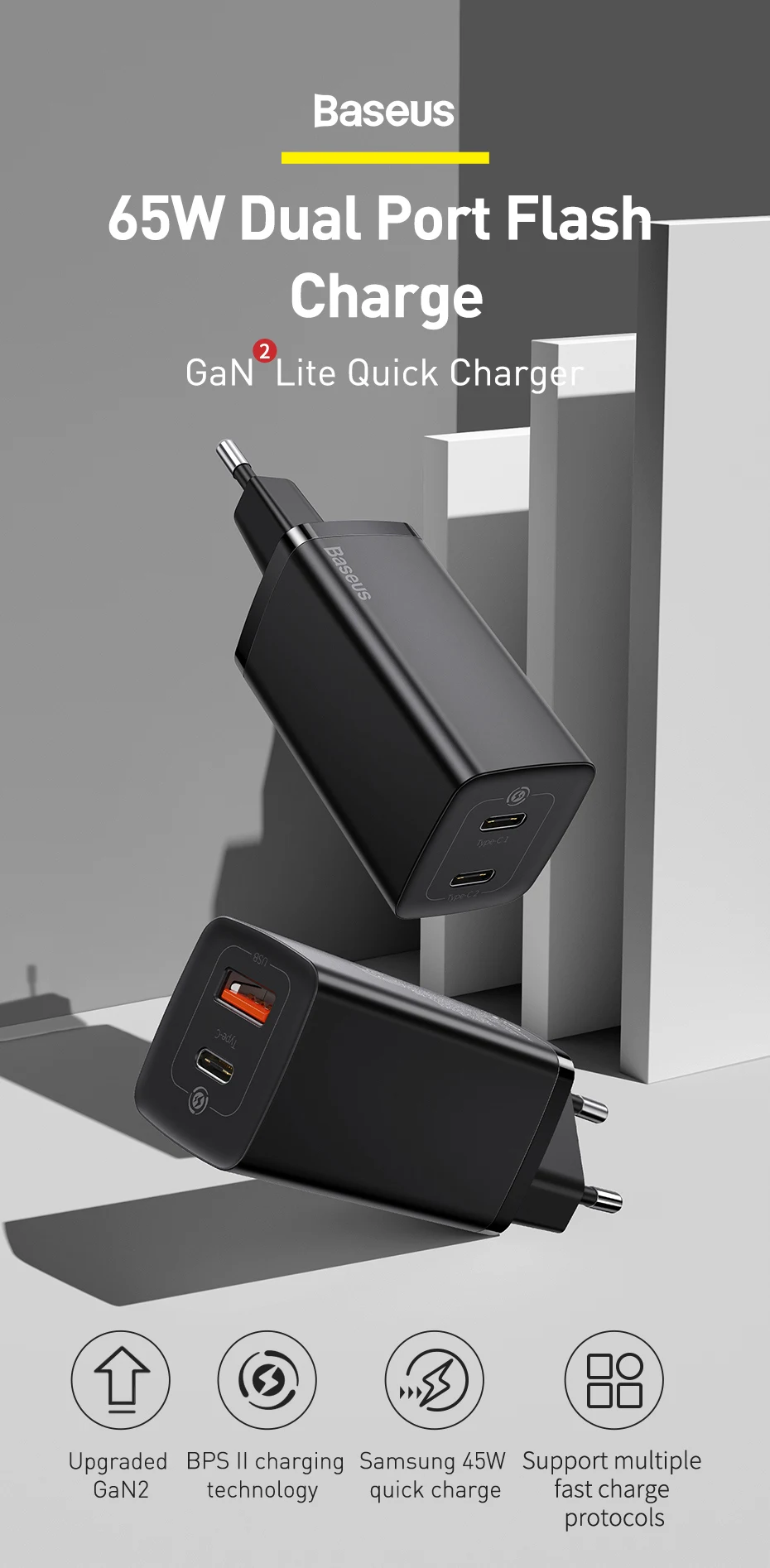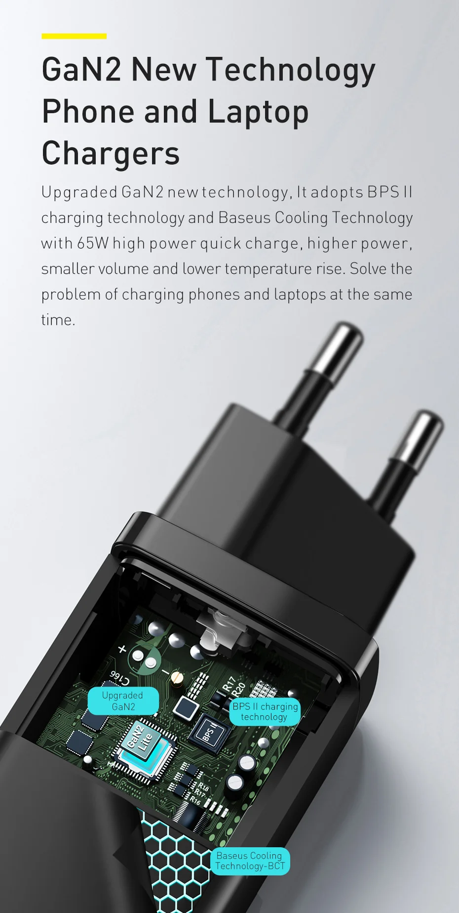 Використання нових напівпровідникових матеріалів «GaN», покращена технологія GaN2 у поєднанні з технологією зарядки BPS та технологією відведення тепла BCT, дозволило досягти більшої потужності та знизити нагрівання в мережному зарядному пристрої Basse GaN2 Lite. Зарядний пристрій BASEUS GaN2 Lite має розміри 64 x 35 x 30 мм (без вилки) при потужності 65 Ватт. Поєднує кілька протоколів швидкого заряджання, дозволяючи одночасно заряджати кілька пристроїв з різними стандартами заряджання.