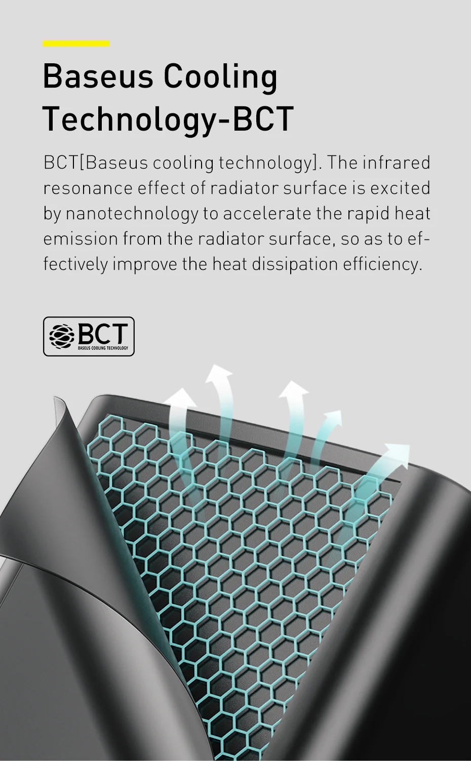 Технологія відведення тепла BCT дозволяє підвищити ефективність розсіювання тепла, зменшуючи нагрів компонентів зарядного пристрою. Зарядний пристрій працює в діапазоні вхідної напруги від 100 до 240 Вольт змінного струму, що відповідає міжнародним стандартам.