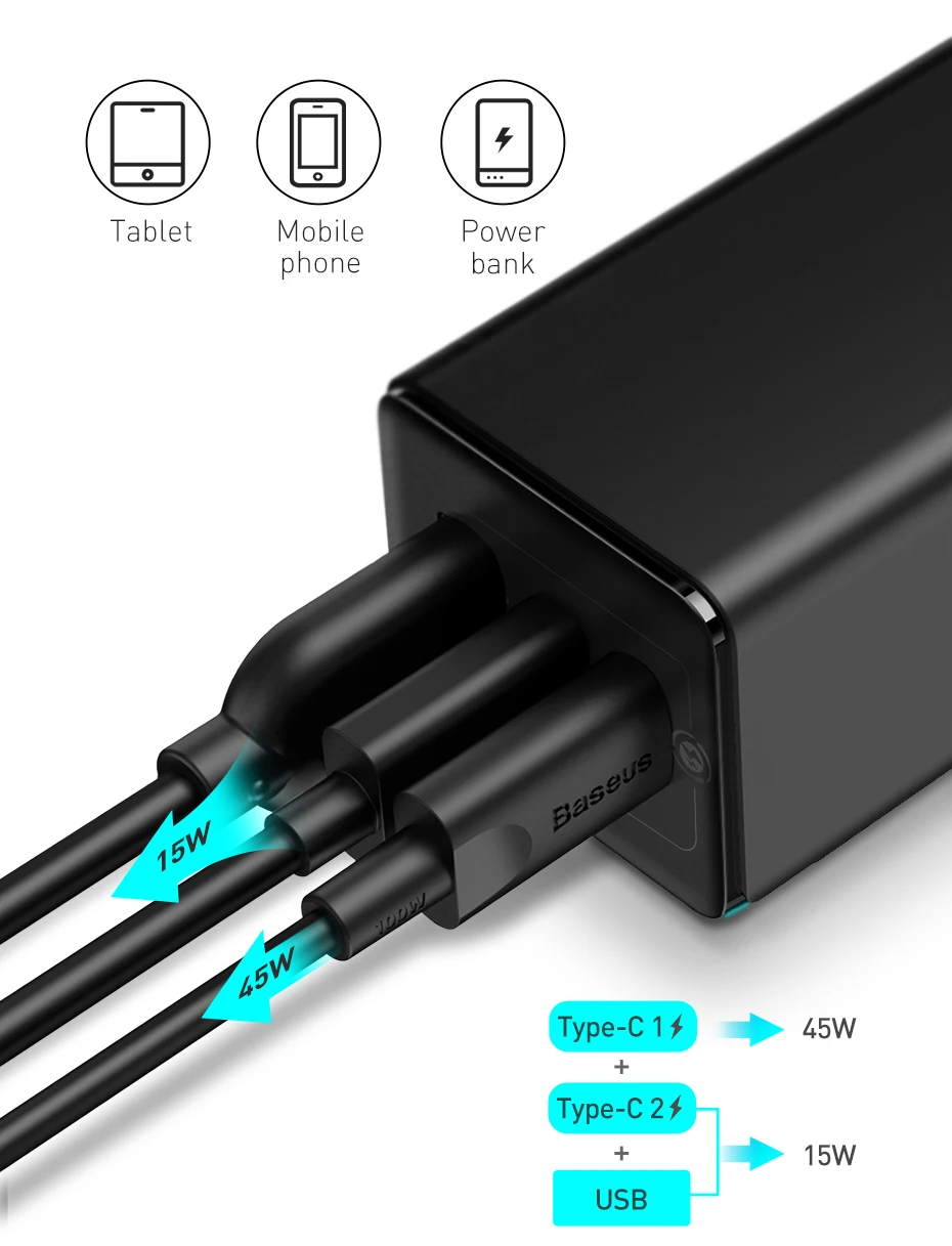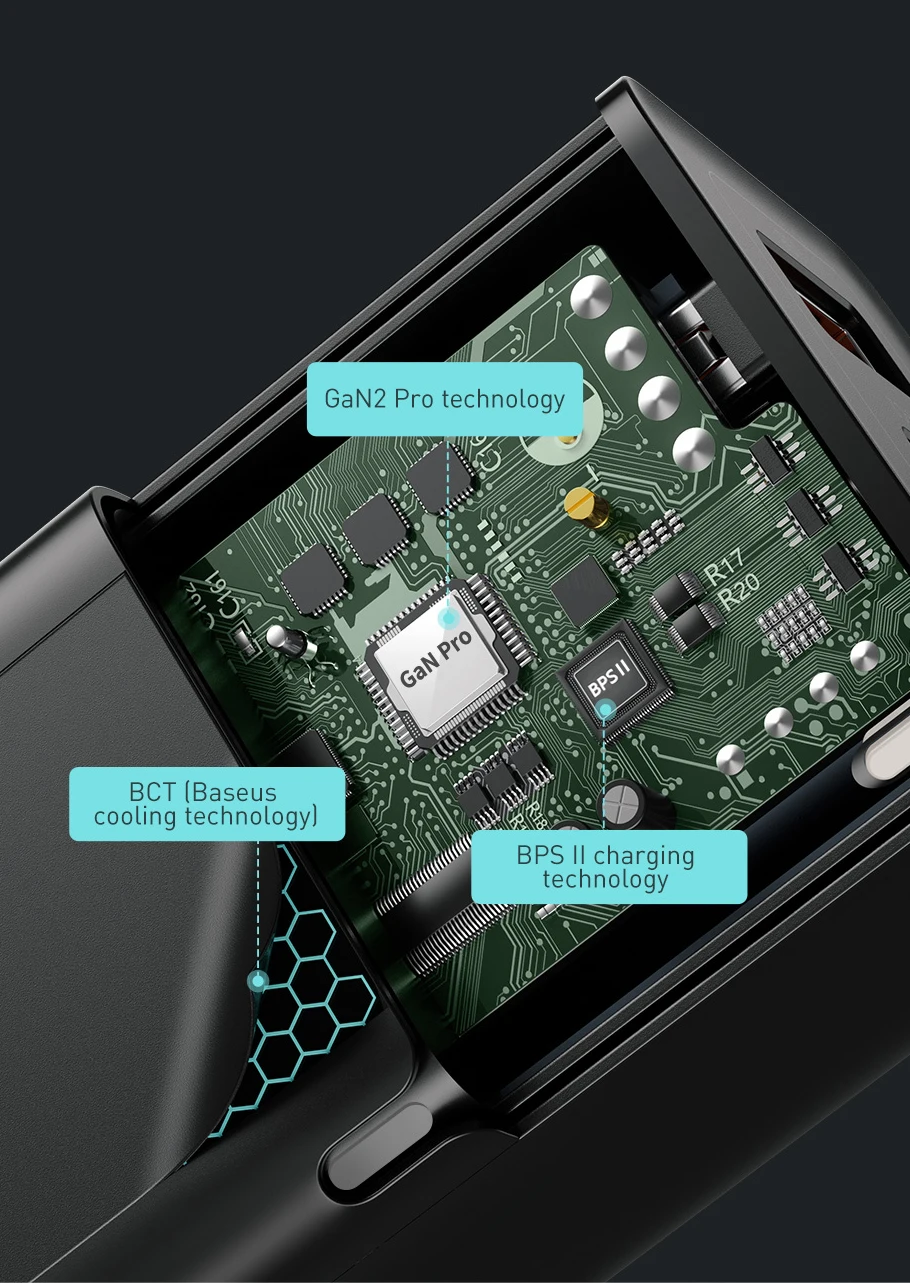 Мережевий зарядний пристрійBaseus GaN2 Pro Quick Charger 65W належить до нового покоління зарядних пристроїв на основі напівпровідників GaN (нітрид галію). Використання нових матеріалів дозволило знизити вагу та габарити пристрою на 30% без втрати ефективності. Зарядка практично не нагрівається, споживає менше енергії та заряджає гаджети швидше, ніж звичайні адаптери живлення. Вихідної потужності режиму PD 65 Вт достатньо для живлення невеликого ноутбука, наприклад MacBook.