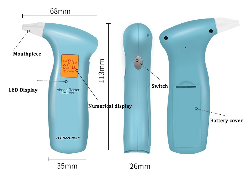 Алкотестер KWS-712T має екран, на якому висвічується результат вимірювання у конкретних цифрах. Це проміле з точністю до десятих і відсоток алкоголю в крові з точністю до другого знака від коми (ВАС). Колір екрану теж відображає ступінь неприємностей, які можна отримати у відповідній кондиції. Для дотримання норм гігієни при тестуванні є кілька мундштуків для різних людей.