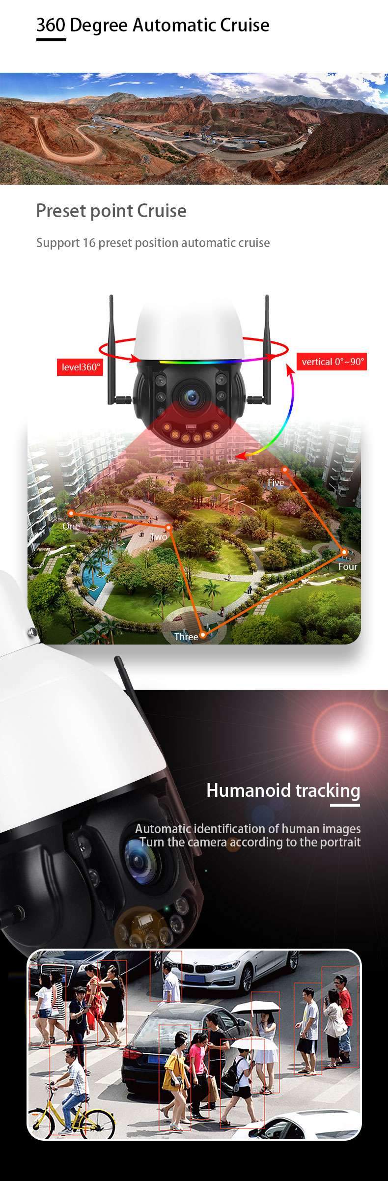 Automatic rotation, humanoid tracking, 16-position fixed-point Cruise