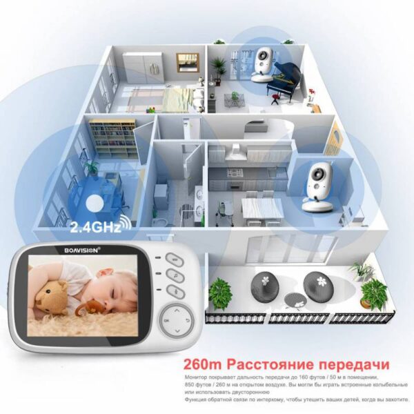 Радіус передачі сигналу між дитячим та батьківським блоком становить 50 метрів у приміщенні та до 260 метрів на відкритому просторі. Цього достатньо, щоб використовувати відеоняню Boavision VB603-EU не тільки у квартирі, а й у великому будинку.