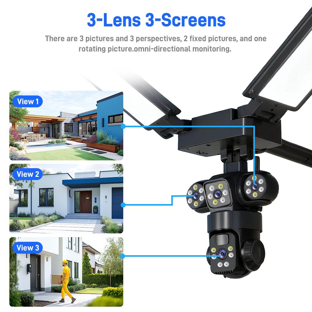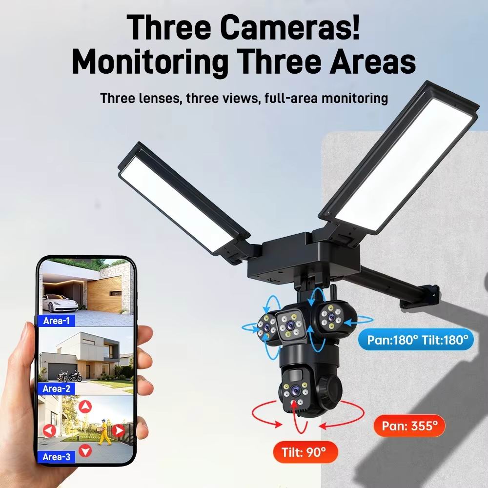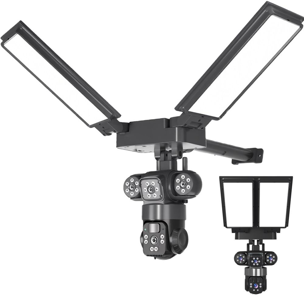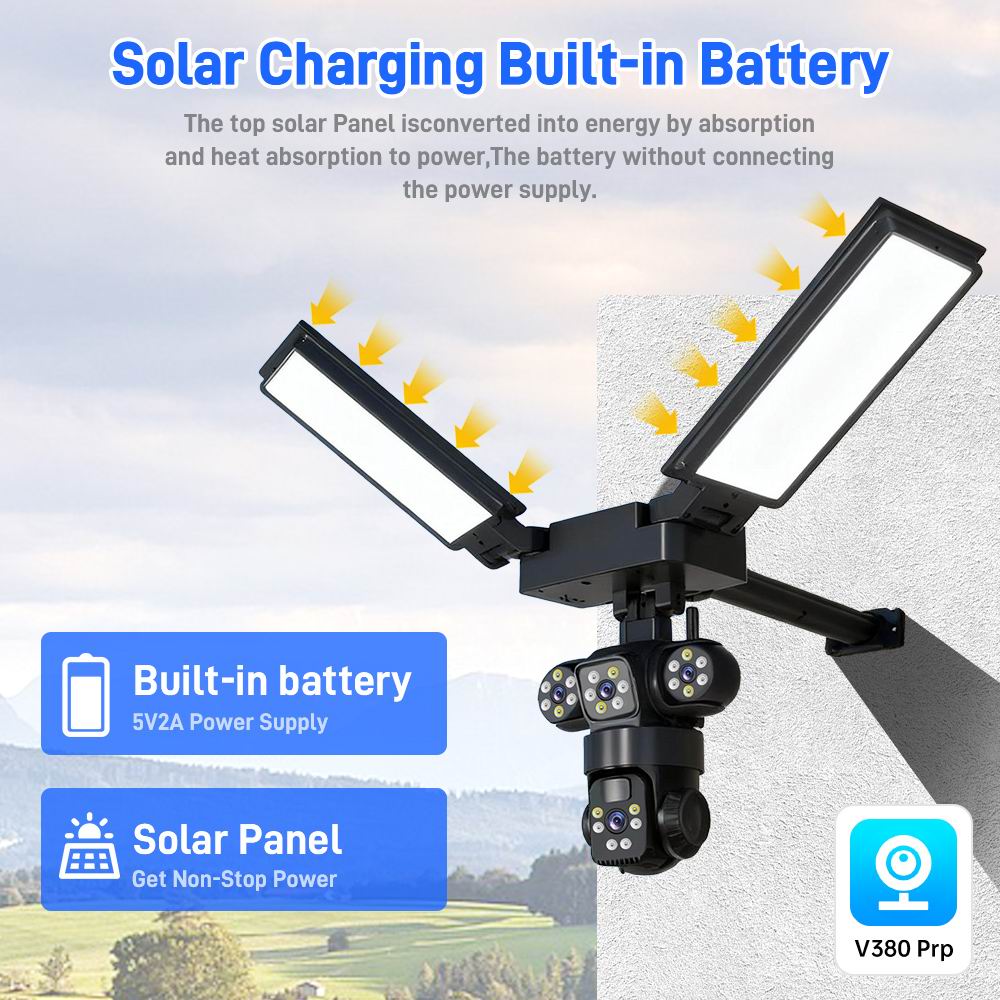 Зовнішня бездротова камера відеоспостереження на сонячній батареї з живленням від вбудованих акумуляторних батарей та сонячної панелі, а також низьке споживання та просте встановлення. Великий діапазон обертання: горизонтальний: 90 °, вертикальний: 120 °; кут огляду забезпечує повний огляд на 360 °.