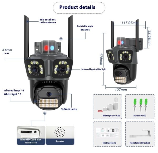 Вбудовані білі світлодіоди та ІЧ-світлодіоди дозволяють вибрати кольорове нічне бачення або інфрачервоне чорно-біле нічне бачення.