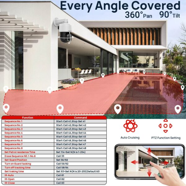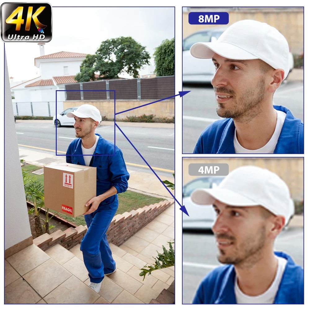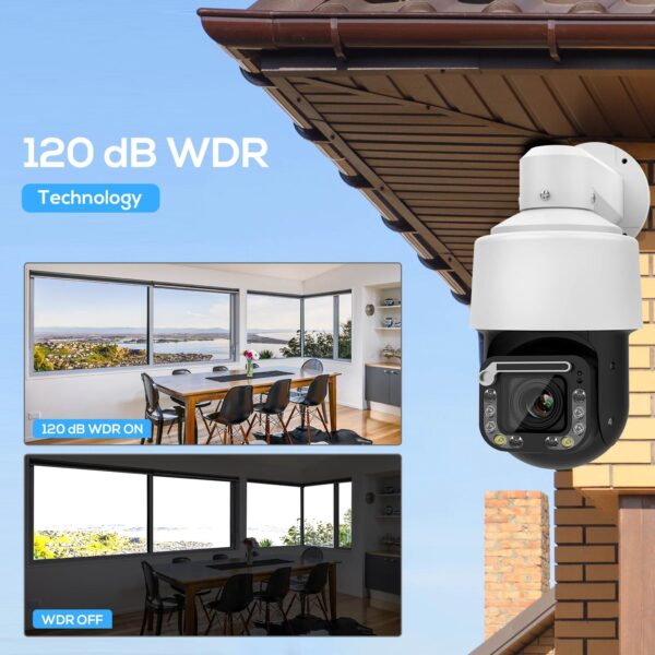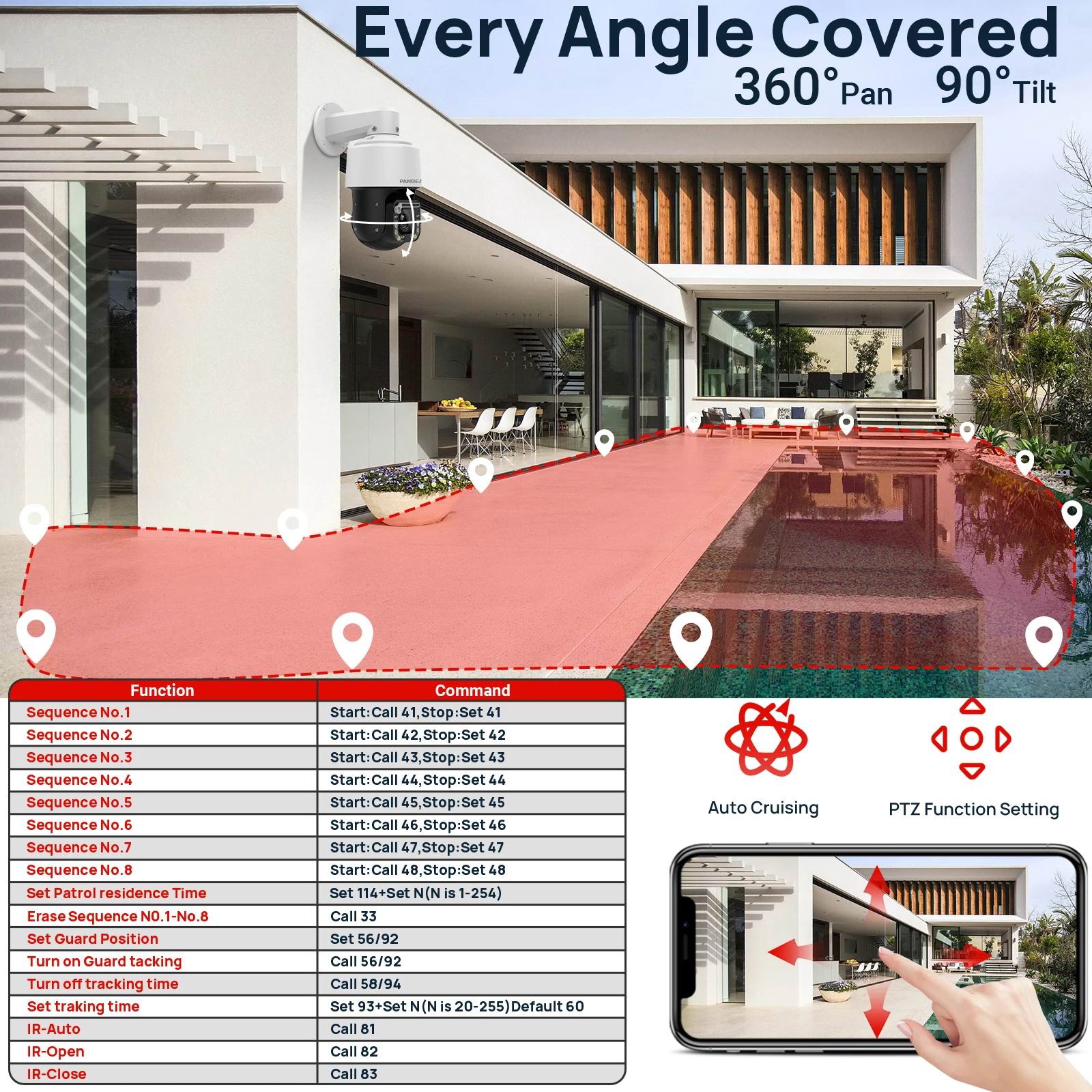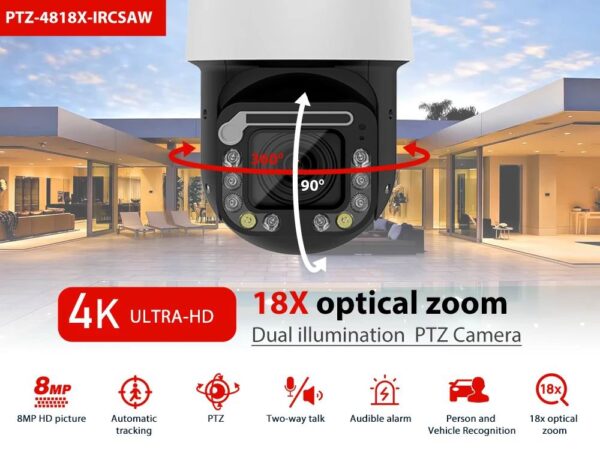 Ця вулична камера PoE PTZ з роздільною здатністю Ultra HD 8 МП (3840×21608) при 25 кадрах/с та 1/2,8-дюймовий CMOS-сенсор Sony для роботи в умовах низької освітленості забезпечує надзвичайно чітке зображ