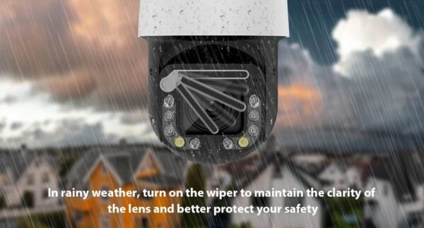 Ви можете ввімкнути склоочисник, щоб підтримувати чіткість об’єктива та краще захистити свою безпеку. Завдяки захисту від атмосферних впливів IP66, камера захищає від пилу, вітру та дощу рівня урагану, чудово працює навіть за екстремальних погодних умов. Водонепроникна кришка, що постачається в комплекті, захищає кабель Ethernet на відкритому повітрі. Робоча температура від -30°C до 60°C (від -22°F до 140°F).