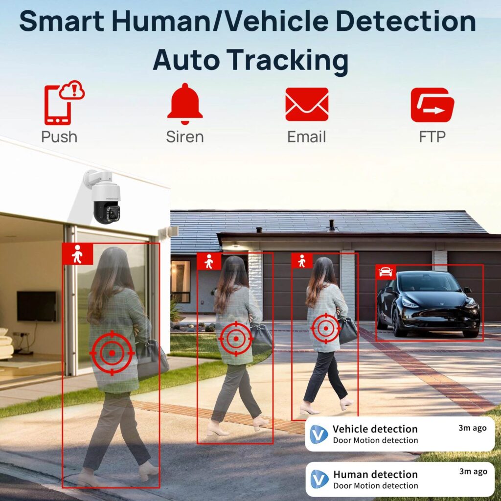 Камера PoE PTZ поєднує в собі виявлення людини/транспортного засобу з автоматичним відстеженням гуманоїдів, щоб фільтрувати 98% небажаних тривог за допомогою алгоритму глибокого навчання. Коли 8-мегапіксельна IP-камера PTZ виявляє гуманоїдну ціль, вона автоматично відстежує рухому людину, щоб стежити за підозрілою активністю.