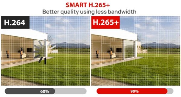 Ця 8-мегапіксельна PTZ-камера PoE для зовнішнього використання має формат кодування H265+, який може ефективно зменшити обсяг сховища відео, дозволяючи записувати довші відео. Порівняно з кодуванням H.264, це зменшує вимоги до сховища на 83%.
