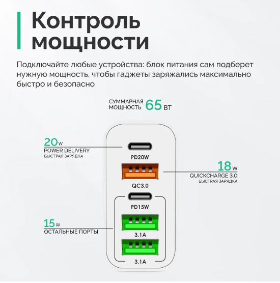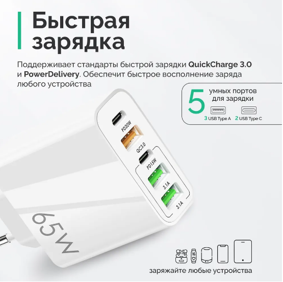Зарядний пристрій USB 65 Вт, швидке заряджання 3,0, 5 портів