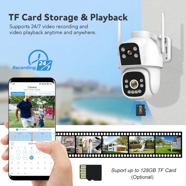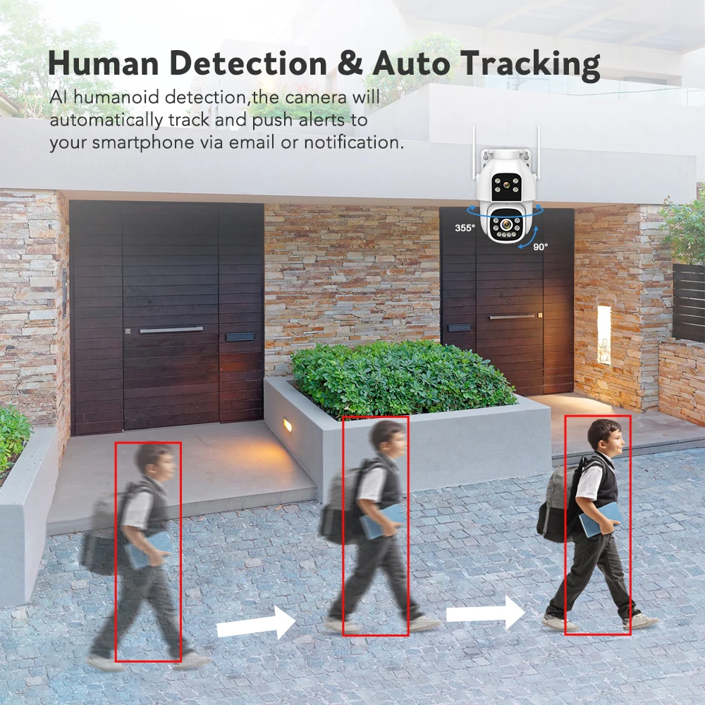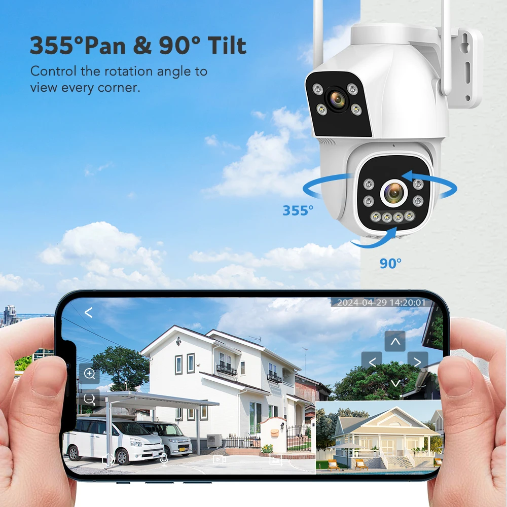 Завдяки горизонтальному повороту на 355° та вертикальному повороту на 90°, ви можете дистанційно керувати зовнішньою Wi-Fi камерою, щоб переглядати кожен куточок за допомогою мобільного телефону.