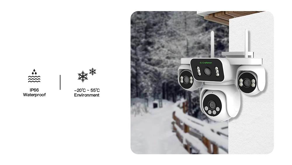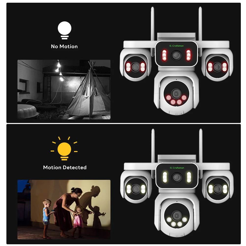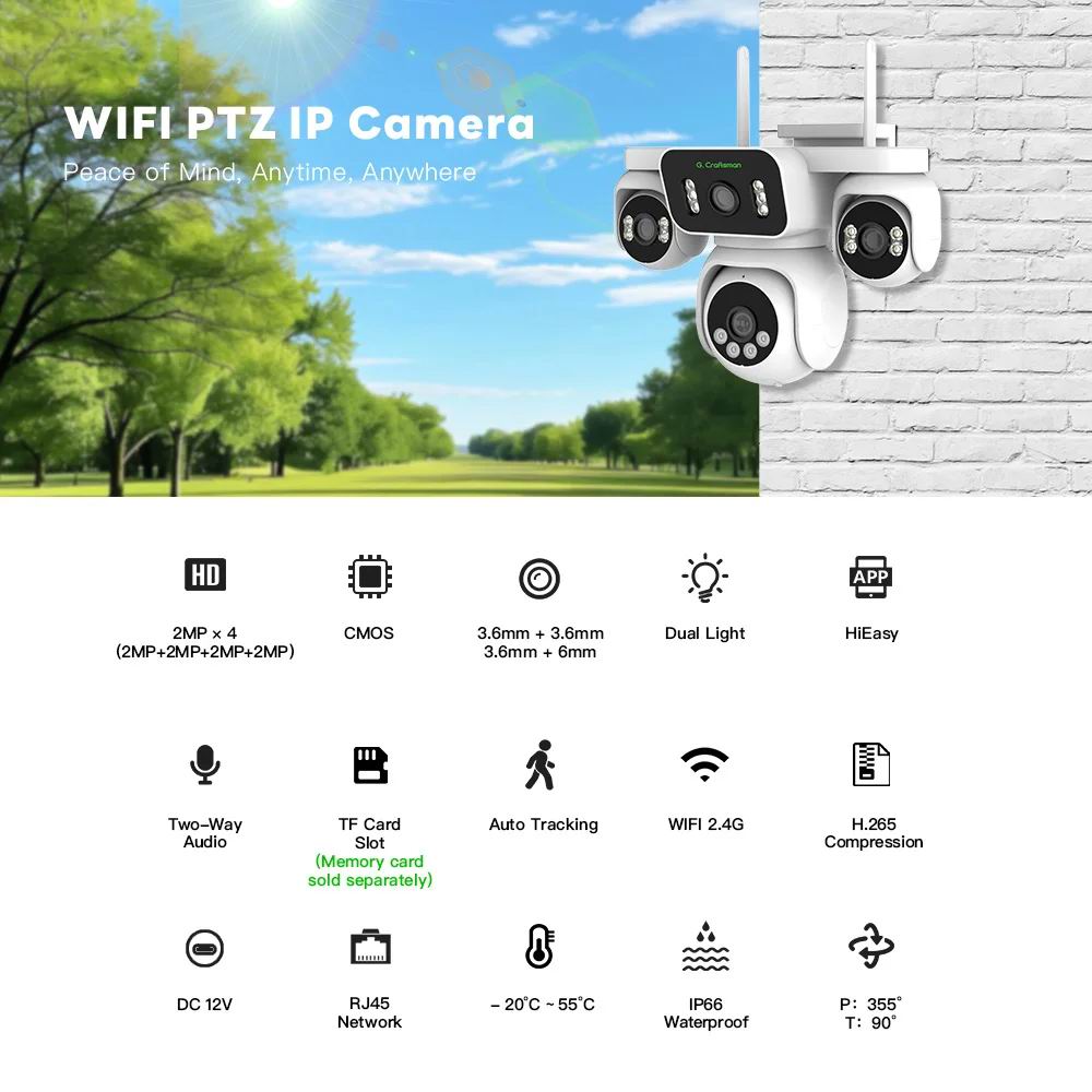 Оснащена головним чіпом керування Hisilicon, PTZ-камера G.Craftsamn gun-ball забезпечує 4-канальну потокову передачу 1080P для комбінованого 8-мегапіксельного ультрачіткого зображення, що забезпечує безперебійне панорамне спостереження на 360 градусів за допомогою одного пристрою.