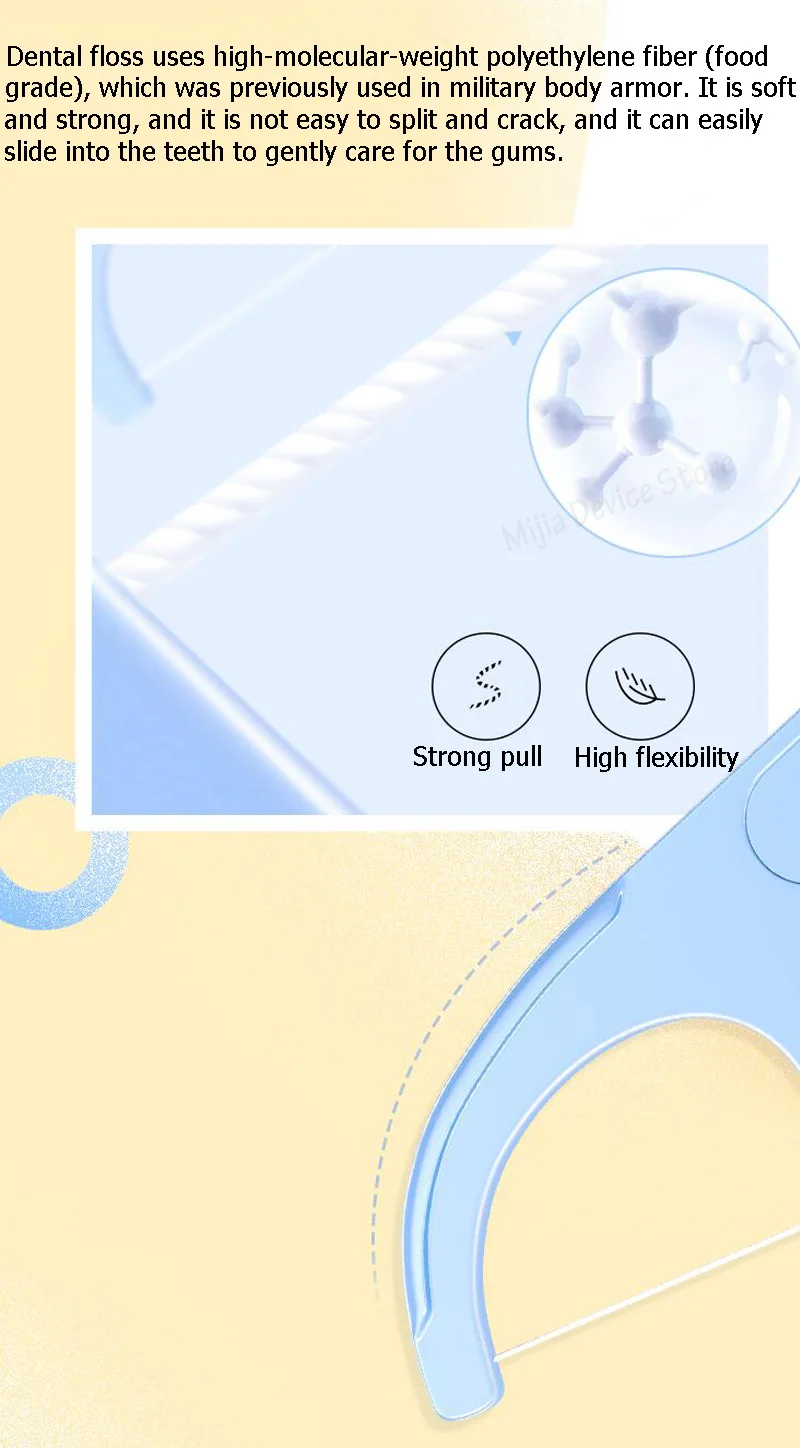 Нитка дуже міцна, але зроблена з м’якого полімерного волокна, тому вона не нашкодить яснам та зубам. Міцності нитки позаздрять багато брендів, тому що з такого ж спресованого волокна роблять бронежилети. Кожна нитка витримує 3,15 кг навантаження. Це ідеальні показники для безпечного видалення залишків їжі між зубами, оскільки через них накопичуються бактерії, з’являється неприємний запах, зубні хвороби, карієс, пародонтоз тощо.